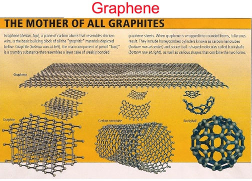 Discovered in the 1990’s. Graphene is basically a single layer of graphite, a hexagonal array of carbon atoms extending over two dimensions endlessly. It’s the stuff that carbon nanotubes are made of and it’s the stuff that graphite is made of. Graphite is many layers of this same material stacked on top of each other.