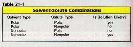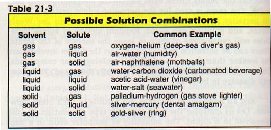 Four simple solution situations can be considered. They are listed in Table 21-1. Not all possible combinations of substances will fit into these four rigid categories. However, we will now consider these four as sample cases for studying solutions.