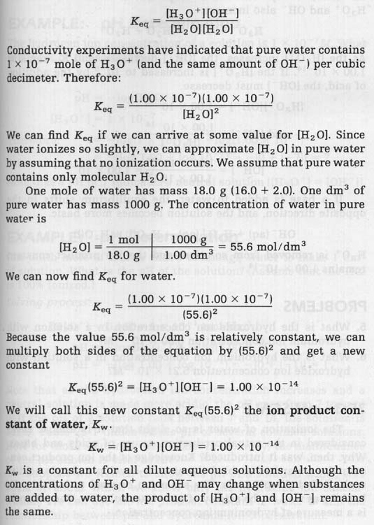 The ionization of water is so slight that it is almost never considered in the actual production or use of acids and bases. Why, then, was it introduced? Knowledge of the ion product constant for water has enabled chemists to develop a simple acidity scale, called the pH scale. The scale can be used to indicate the basicity as well as the acidity of any water solution. The pH scale is a measure of hydronium ion concentration.