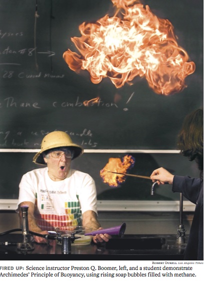 Then, with pith helmet and goggles, I have students ignite the bubbles with a 50 cm wood splint as they rise up about one-meter above the horn.