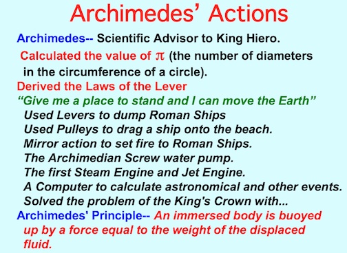 To test the crown, Archimedes weighed it in air and again when suspended under water. The loss of weight in water is called the Buoyant Force and is the weight of the displaced water.