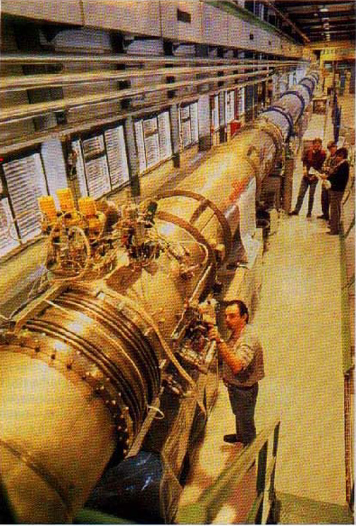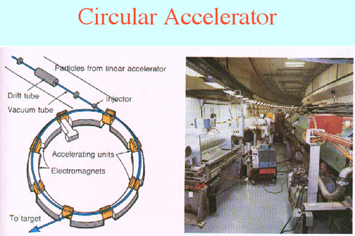 Nuclear Accelerators use high voltages to accelerate charged particles and big magnets to bend the particles. Video: